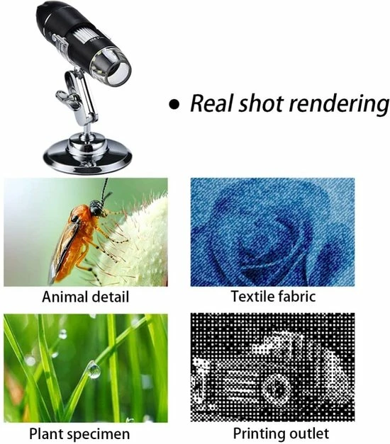 - 【50X-1600X USB digitale microscope】Met behulp van krachtige 1600x digitale microscoop kun je details duidelijk zien van de objecten zoals wezens, munten, vlinders, geïntegreerde printplaten, huid, pcB, bladeren en andere dingen die je wilt observeren.