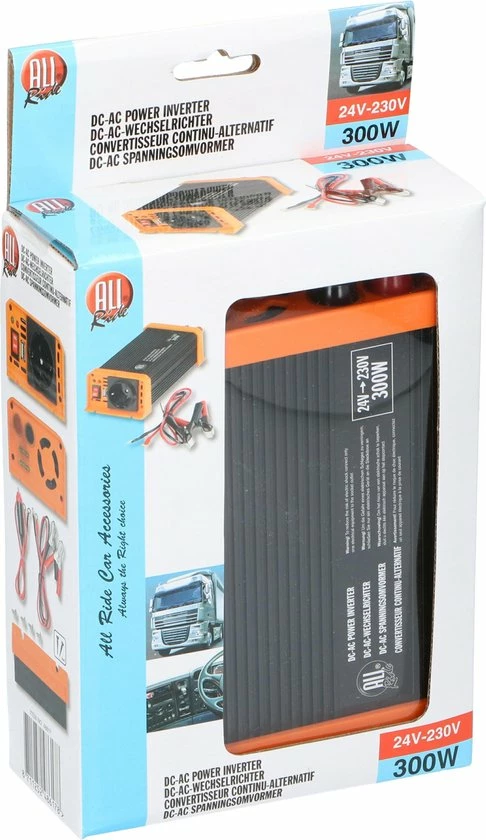 Klein van formaat, licht van gewicht en stabiel. Deze All Ride spannings-omvormer vormt 24 volt in de vrachtwagen om naar 230 volt. De aan te sluiten apparaten mogen maximaal 300 watt vermogen vragen.