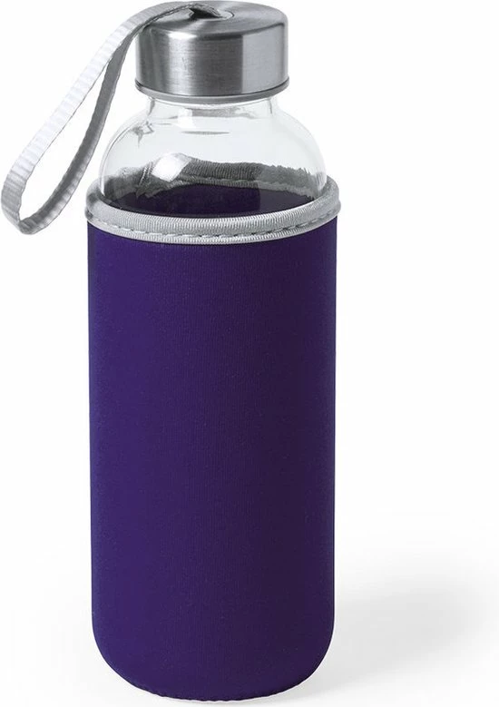 Bellatio Design Glazen Waterfles/drinkfles Met Paarse Softshell Bescherm Hoes 420 Ml – Sportfles – Bidon