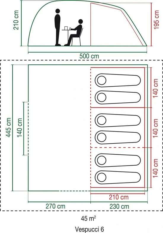 Ben je op zoek naar een grote, degelijke tent? De Coleman Vespucci 6 biedt alle ruimte die je nodig hebt. Zo geniet je van een grote gezamenlijke leefruimte waar met gemak een tafel en zes stoelen in passen. De 3 XXL slaapcabines zijn van elkaar gescheiden met een wand en bieden genoeg plek voor luchtbedden. Omdat de tent hoog is, kun je overal rechtop staan en je vrij bewegen.