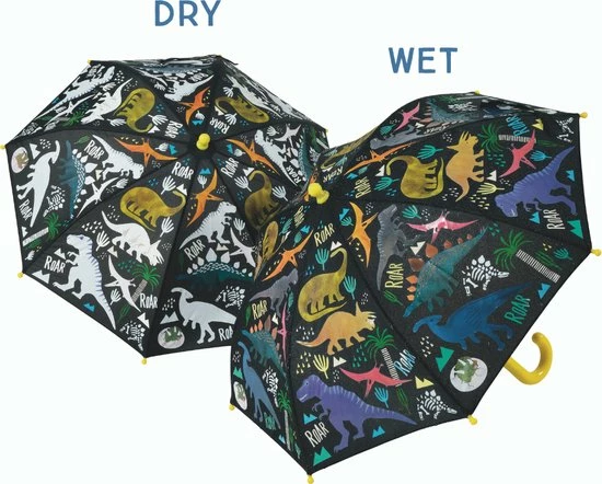 Floss & Rock Paraplu, Dino. Tover een regenbui om tot iets magisch met deze wonderbaarlijke paraplu! Als er regen op deze paraplu valt verandert hij langzaam van kleur! De dinosaurussen krijgen in de regen hun mooie kleuren. Een leuke stimulans om, zelfs bij slecht weer, buiten te zijn. Ideaal voor de wandelingen van en naar school, de peuterspeelzaal of kinderdagopvang. Ook leuk als cadeau.
