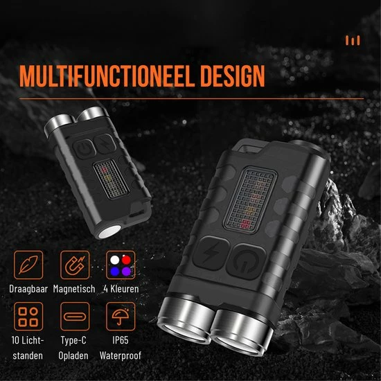Deze met USB-C oplaadbare zaklamp met 2 indrukwekkende lichtstralen van maar liefst 900 Lumen is voorzien van een solide behuizing en is waterdicht (IP65).