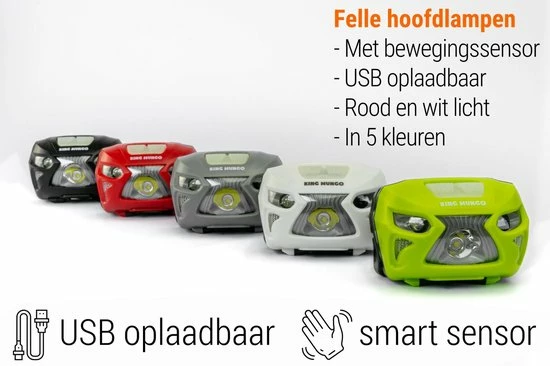 Hoofdlamp LED USB Oplaadbaar Waterdicht met Bewegingssensor, geeft super veel licht en gaat heel lang mee (met oplaadbare batterij). Ultraheldere krachtige King Mungo led hoofdlamp, lichtgewicht en geschikt voor iedere activiteit. Met wit en rood licht. Bevat de nieuwste krachtige XP-E / XP-G2 CREE leds die veel licht geven.