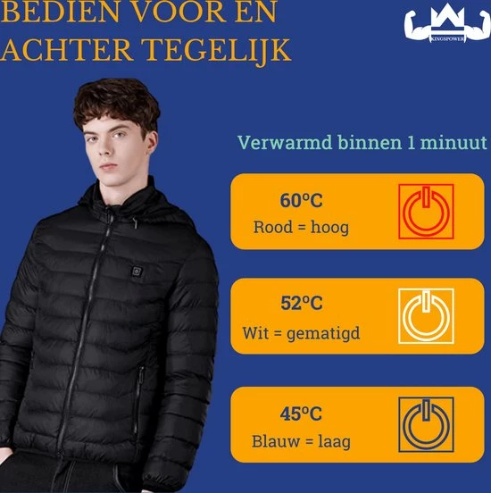 Gelukkig hoeft dit niet alleen maar een gedachte te zijn, de verwarmde winterjas bestaat echt! Met een simpele druk op de knop (3 á 4 seconden vasthouden) wordt jouw elektrische jas al binnen 1 minuut warm, en wil je tussendoor ook nog duurzaam energie besparen? Ook dat kan door de 5 verschillende warmtestanden: