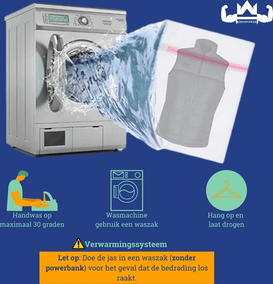 Het is mogelijk om de jas te wassen dit kan op de hand of in de wasmachine. Wij raden aan om de winterjas in een waszak op 30 graden te wassen voor extra bescherming. Verwijder voor het wassen altijd de powerbank.