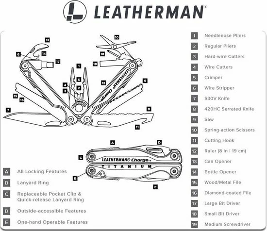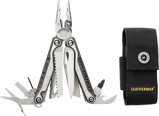 De Leatherman Charge TTI PLUS is de verbeterde versie van de Charge TTI, het topmodel binnen de Leatherman collectie. De Charge TTI PLUS is deels uitgevoerd in titanium. Het meslemmet is gemaakt van S30V staal. De Leatherman Charge TTi is één van de uitgebreidste modellen van Leatherman en voorzien van 19 functies. Alle tools in de Leatherman Charge TTI zijn voorzien van een vergrendeling om ongelukken met bijvoorbeeld het mes te voorkomen. Bij de Leatherman Charge TTi komt met een mooi passende foedraal, pocketclip, bevestigingsring en een bitset bestaat in totaal uit 8 verwisselbare bitjes (met Europese maatvoering) met 16 functies. De bitset kan vervolgens uitgebreid worden met de Leatherman Bit Kit. Op de Leatherman Charge TTI multitool krijgt u 25 jaar garantie.