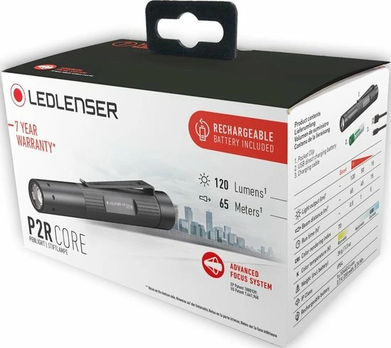 De kleinste en lichtste P-serie lamp biedt een aanzienlijke lichtopbrengst in een compacte behuizing. Met een clip kan de penlamp eenvoudig aan een overhemd of broekzak worden bevestigd en is altijd klaar voor gebruik. De P2R Core wordt geleverd met oplaadbare batterij, Endcap Switch en het door Ledlenser gepatenteerde Advanced Focus System.