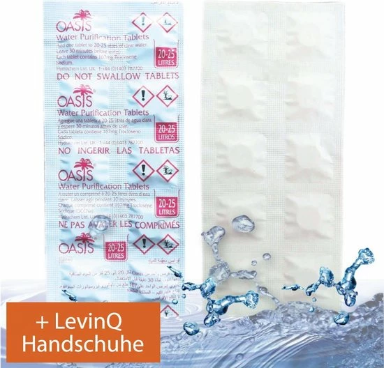 De waterzuiveringstabletten van Oasis worden geleverd in een strip van 10 stuks met LevinQ® handschoenen.