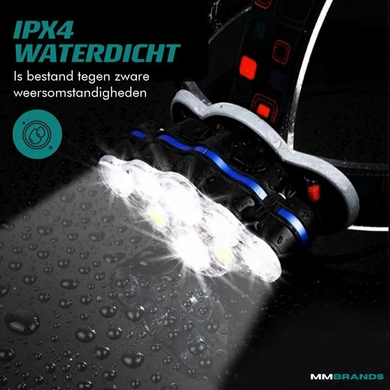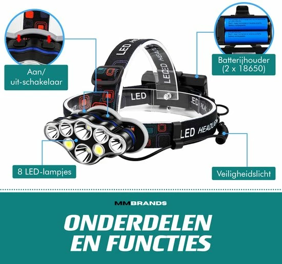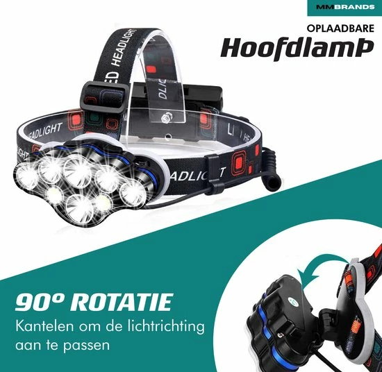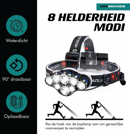 Kies voor verschillende gebruikersdoelen de ideale lichtsetting en geniet altijd van voldoende licht met de MM Brands Hoofdlamp. De 8 ultra sterke 1800 lumen led-lampen schijnen tot wel 600 meter vooruit en zijn verstelbaar in 8 standen.