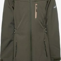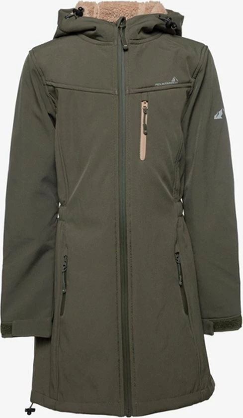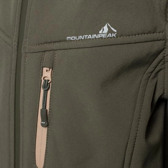 Groene softshell jas uit de Mountain Peak collectie. Voorzien van een een waterdichte ritssluiting met kinbeschermer en windstopper en een vaste, warmgevoerde capuchon met aansnoerkoordjes. De jas heeft twee zakken met ritsen en een extra borstzakje met ritssluiting. Voorzien van een voering van extra zacht fleece. De softshell jas is winddicht, ademend, warmte regulerend en sneeuw/waterafstotend. Gemaakt van 95% polyester en 5% elastaan met een waterkolom van 3000 MM.