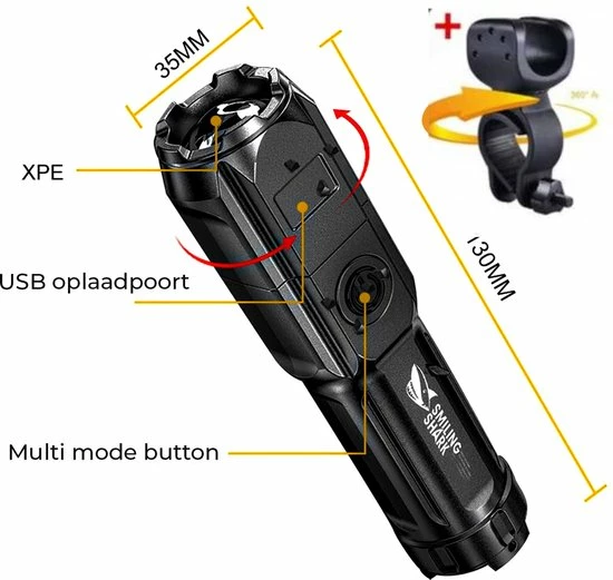 Door de inzoombare verlichting werk je met een brede of smalle lichtstraal. Voorzien van een fel, medium, stroboscoop en SOS signaal verlichting is deze krachtpatser alles wat je nodig hebt. De krachtige XPE LED is sterker dan autoverlichting en zorgt voor een geweldige lichtstraal. Opladen doe je met USB en de lamp is spatwaterdicht IP65. De 2000 lumen lichtbron zorgt voor een ontzettend krachtige lichtstraal.