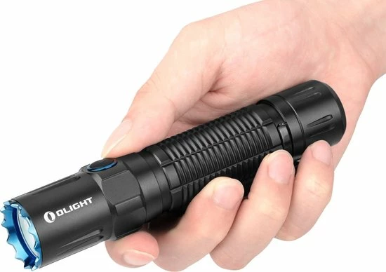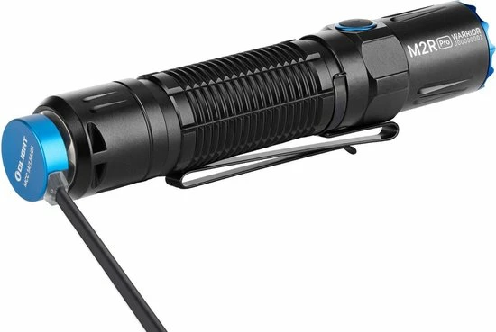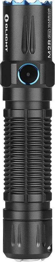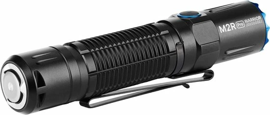 De Olight M2R Pro Warrior is een echte tactische toplamp, geschikt voor beveiligings- en verdedigingsdoeleinden voor o.a. politie, boa’s, stadswachten en hulpverleners. De Pro Warrior geeft 1.800 Lumen licht en heeft een bereik van maximaal 300 meter. Deze Pro Warrior is de eerste zaklamp ter wereld met zijschakelaar plus een extra achterschakelaar die magnetisch op te laden is. Extra bijzonder aan de Olight M2R Pro Warrior is dat hij zowel standaard als tactisch te gebruiken is. Het aan/uit zetten van deze bedieningsprogramma’s gebeurt door de achterschakelaar en de zijschakelaar tegelijkertijd in te drukken. Omdat de lamp bediend wordt door de achterschakelaar, ligt de Pro Warrior altijd zo in de hand dat de geribbelde blauwe bezel altijd direct dienst kan doen als zelfverdedigingsring. Dat maakt deze krachtige tactische zaklamp tot een ideale, compacte lamp voor veiligheid en persoonlijke bescherming.