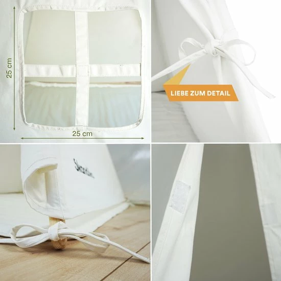 - 100% KATOEN: Dankzij de hoogwaardige materialen zoals dik, niet-giftig katoen en acacia is de tipi slijtvast en stevig. Dankzij de stabiele constructie staat de tent stevig en is het een speelkameraadje dat lang meegaat.