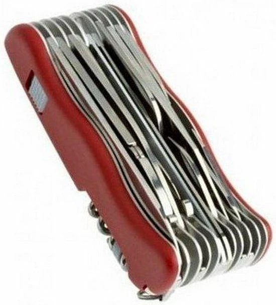Verder bestaat het zakmes uit een flesopener, draadstripper, houtzaag, metaalzaag, metaalvijl, blikopener, steek- en boorpriem, schaar, cmbitang, draadknipper,krimptang, pincet, tandenstoker, sleutelring en schroevendraaier.