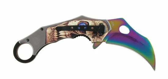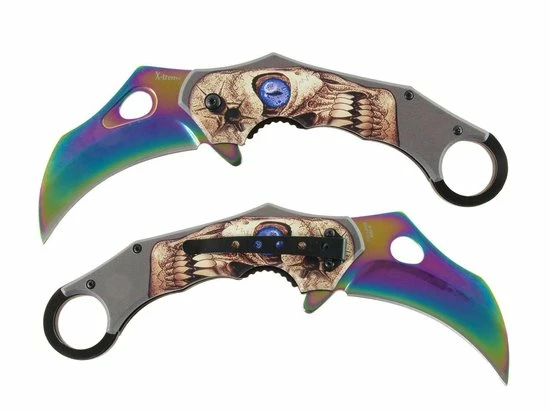 Dit X-Treme Karambit zakmes is voorzien van een ‘assist flipper’, waarmee het mes razendsnel geopend kan worden, wat doet denken aan een ouderwets vlindermes. Een vlindermes is, net als een stiletto, verboden bij ons, maar de X-Treme Karambit is gewoon toegestaan, indien juist gedragen/gebruikt natuurlijk. Deze roestvrijstalen X-Treme Karambit heef een glad lemmet met een titanium coating in regenboogkleuren en is voorzien van een 3D skull doodshoofd afbeelding.
